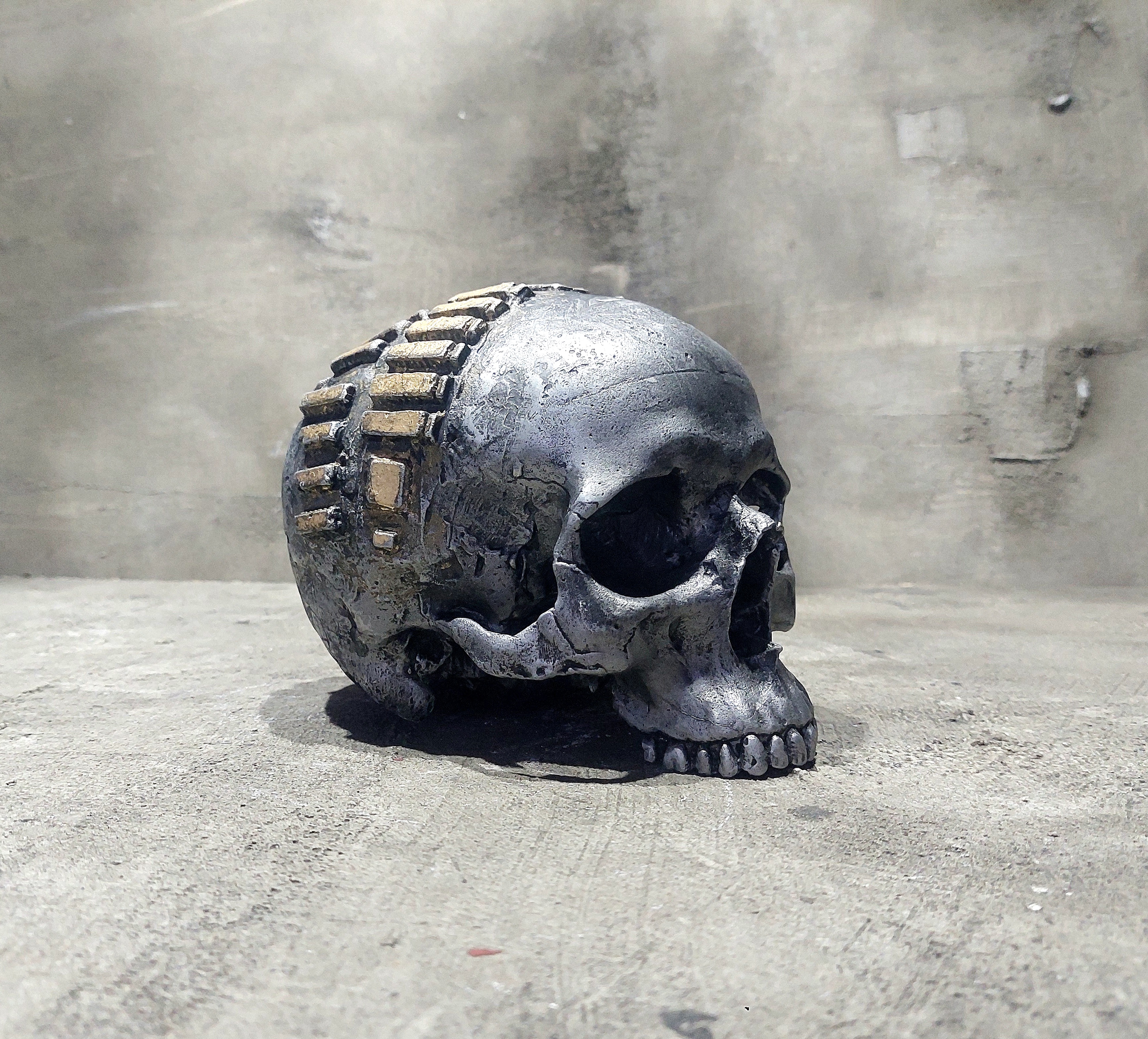 15 x 15 x 20 cm, © 2023, verkochtRuimtelijk | Beelden | Metaal Menselijke schedel real size met geïntegreerde micro-chips , giet aluminium en bladgoud.